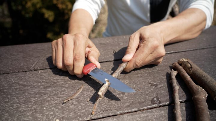 山道を歩きながら途中で落ちている枝を物色し始めた原田さん、どうやら「頂きメシ」の時間に使う道具を自分で作ろうとしているようです。そうこうするうちに、のどかな里を見下ろせる展望台に到着。おもむろにナイフを取り出して枯れ枝を削り始めたら、あっという間に箸とフォークが完成しました。形は少々荒削りではありますが、これもアウトドアの醍醐味!休憩もそこそこに、今回のクライマックス、50mも続く鎖場へと向かいます。