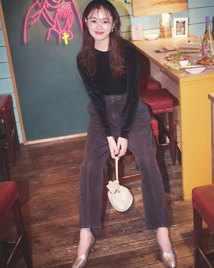 退勤後にイベントが多い金曜日は、通勤もディナーもこなせる華やかな装いが◎。一見カジュアルなデニムパンツはダークトーンを選べば、オフィスにもマッチ。女っぽさ漂うベロアトップスを合わせて、ドレッシーなムードを演出します。仕上げに、カチューシャやパンプスなどレディライクな小物をトッピング。