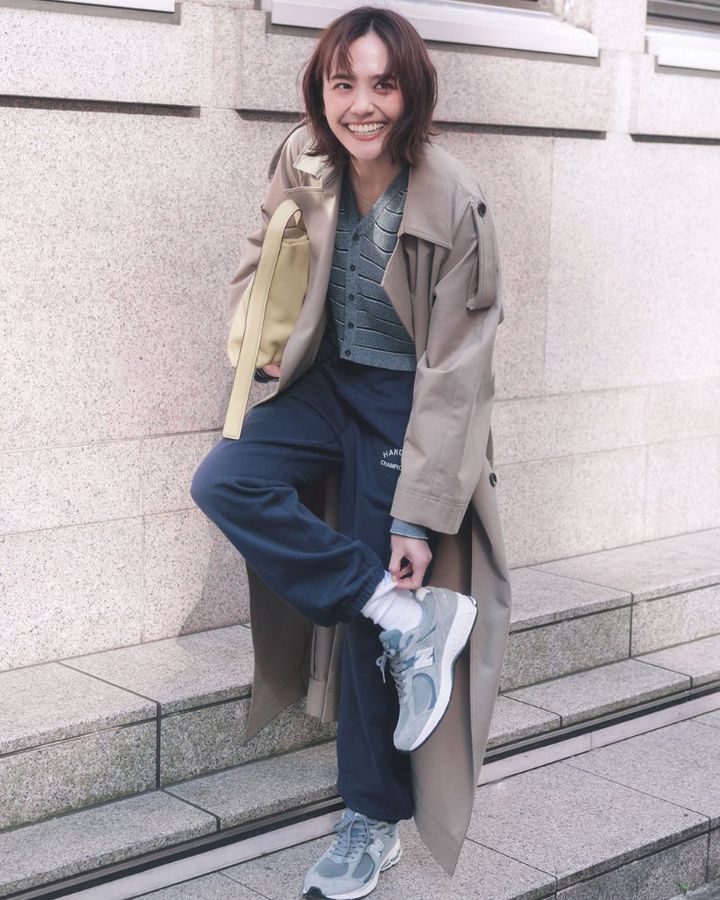 スウェットパンツ¥12,650(ハンドテックス×ジーンズ ファクトリー/ジーンズ ファクトリー 卸団地本店)トレンチコート¥108,900(サクラ/インターリブ)カーディガン¥12,100(ミースロエ/ミースロエ ルミネ新宿1店)バッグ¥49,500(プンティ/エルディスト ショールーム)スニーカー¥19,800(ニューバランス/ニューバランスジャパンお客様相談室)ソックス¥2,970(ラングル/UTS PR)