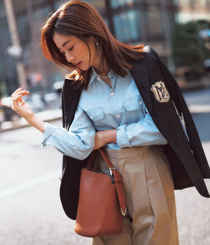 ネイビーの正統派ジャケットを、デニムシャツとチノパンで程よくドレスダウン。エンブレムを効かせた王道トラッドスタイルは今だからこそ新鮮。品格ある一着がお仕事シーンの頼れる相棒に。