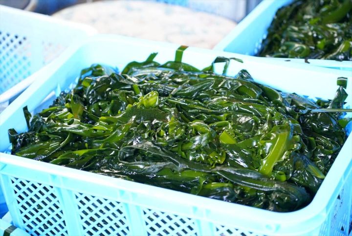 わかめ養殖の歴史が始まったのは1953年。旧末崎漁協(現・大船渡市漁協末崎支所)の小松藤蔵氏が、漁業者の所得向上を目指してわかめの養殖に挑戦しました。道具を一から手作りし、試行錯誤を繰り返した末、1957年には養殖技術を確立。その手法は三陸一帯に広がり、1966年には養殖わかめの生産量が天然ものを上回るまでになりました。さらに1965年、同じ末崎町の佐藤馨一氏が、収穫したわかめを湯通しして塩蔵する保存法を開発。これにより、品質を保ったままの流通が可能となり、「末崎わかめ」はブランドとしての地位を確立していきます。