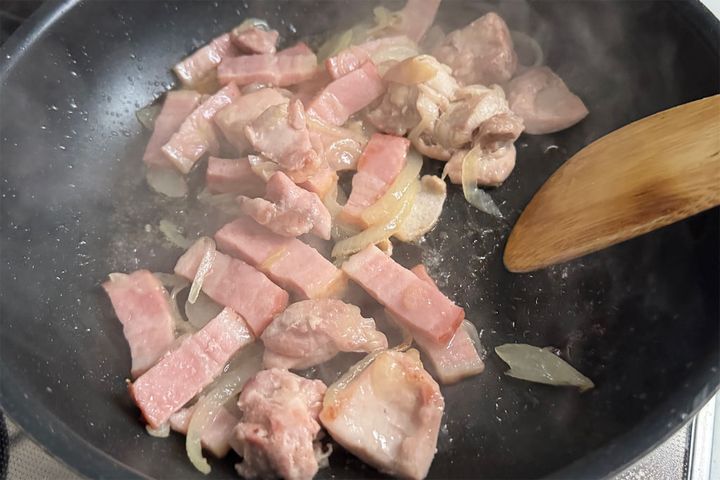 鶏肉の表面が白っぽくなったら、玉ねぎとベーコンを加え、玉ねぎがしんなりするまで中火で炒める。