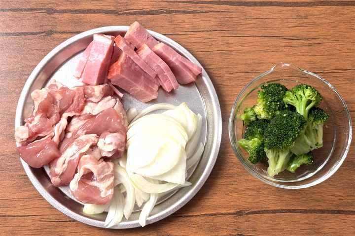 1. 鶏肉は一口大にカットする。玉ねぎは薄切り、ベーコンは5mm幅にカットする。冷凍ブロッコリーは600Wの電子レンジで2分加熱し、水気を取っておく。生のブロッコリーを使う場合は、小房に分けておく。
