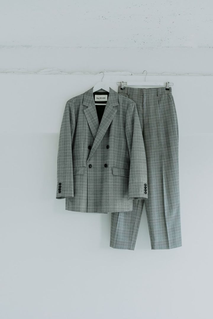 チェック 4ボタン ダブル ジャケット¥20,900(Ray BEAMS)、チェック 1タック パンツ¥14,300(Ray BEAMS)