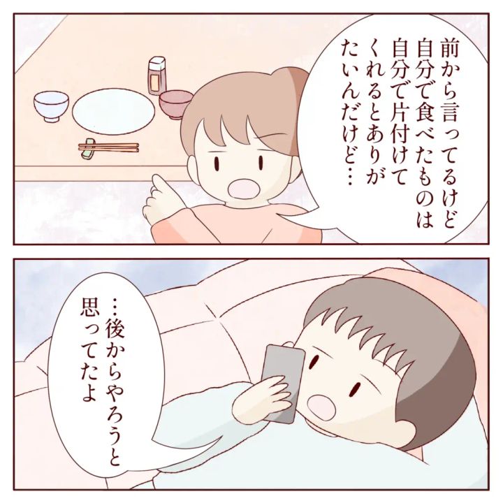 「前から言ってるけど、自分で食べたものは自分で片付けてくれるとありがたいんだけど・・」と下手に出つつそう伝えると、夫はやはりスマホを見たまま「・・後からやろうと思ってたよ」と面倒くさそうに言いました。
