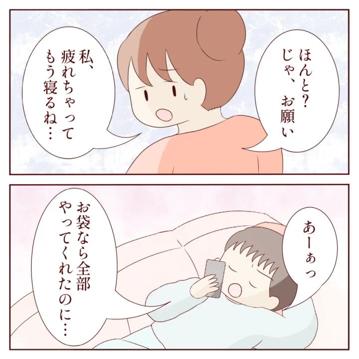 だったらお義母さんにやってもらえばいいのに・・。疲れていた私は何も言い返さずに寝ました。このやりとり、一度や二度ではありません。お義母さんならやってくれるからって、なに?結婚して父親になった男性の言葉とは思えずモヤモヤしました。