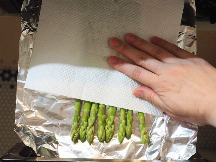 2. グリルにアルミホイルを敷いてアスパラガスを並べ、キッチンペーパーで水気を拭き取る。