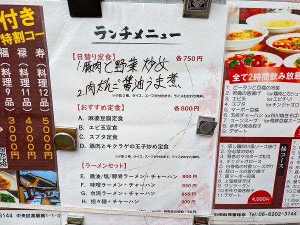 おぉ~、日替り定食が各750円、おすすめ定食が各800円!安い!おすすめ定食のエビ玉定食とスブタ定食、いいですね~。玉子と豚肉は大好物です。いいのがあります。豚肉とキクラゲの玉子炒め定食がいい!豚肉と玉子が入っています。大好物が入った定食です!