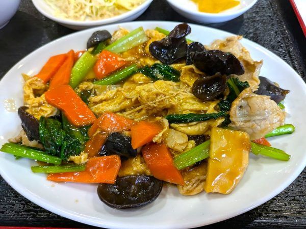 え~っと、豚肉・チンゲン菜・人参・筍・キクラゲ・玉子と具だくさんの炒め物!ここから、厨房が見えるのですが、すっごい火力で炒めておられました。中華料理ならではの火力ですよね~。