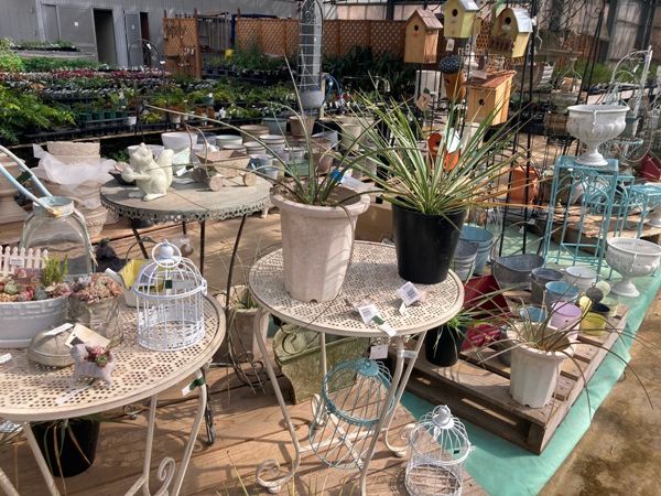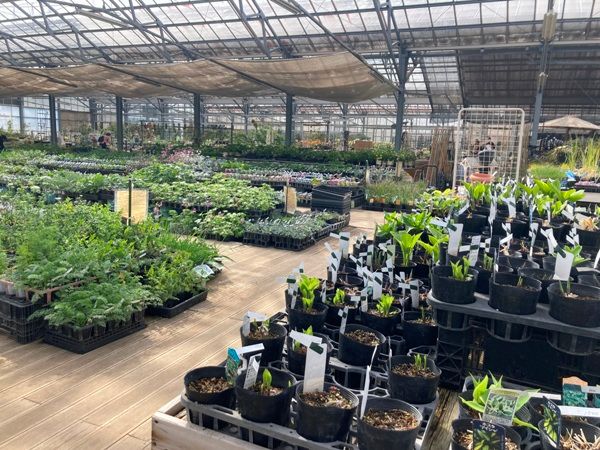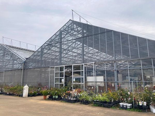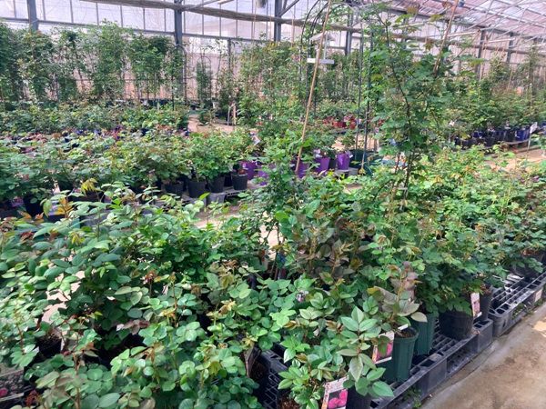お店は大きな温室になっており、店前には主に低木の苗木が、店内には草花やハーブ、バラが陳列されています。