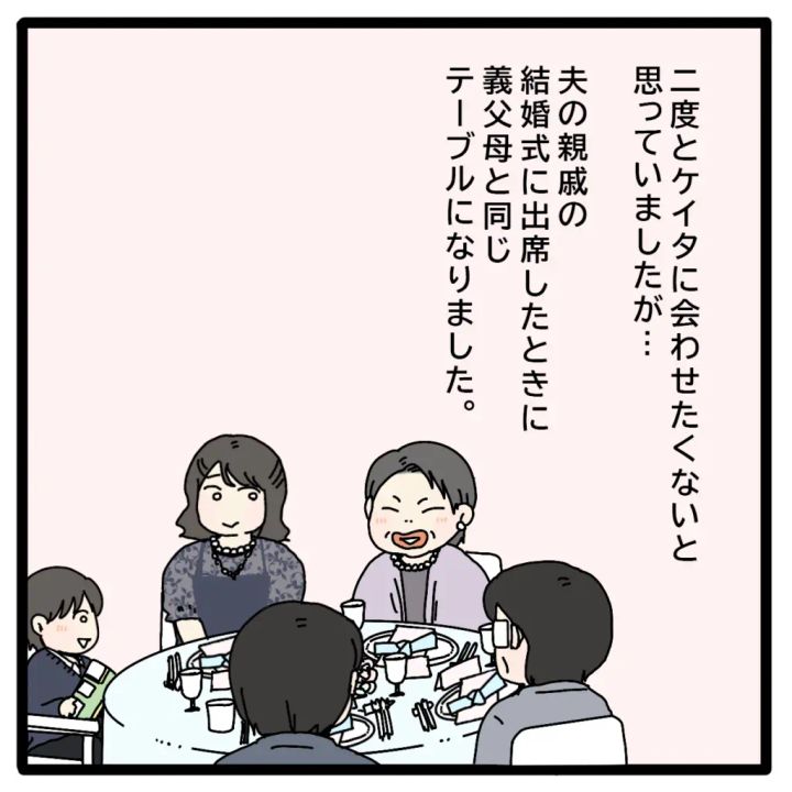 私は、二度とケイタに会わせたくないと思っていたのですが、夫の親戚の結婚式に出席したときに、義父母と同じテーブルになってしまいました。私とケイタに会っても何事も無かったように笑顔で振舞う義母。ぎくしゃくするよりはマシかな、と思いながらみんなと歓談していると、食事が運ばれてきました。