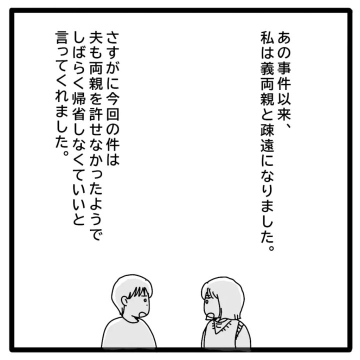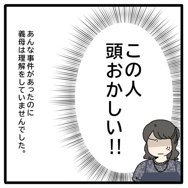 ケイタくんのアレルギー発作事件以来、義父母と疎遠になったマリさん。タツヤさんも今回は両親を許せず、しばらく帰省しなくていいと言っていました。その後、タツヤさんの親戚の結婚式に参列した際、ケイタくんにアレルギー除去食を食べさせていると、「ケイくんまだアレルギーなの?」シレっとそんなことを言う義母を見て、「この人頭おかしい!!」と事件があったにもかかわらず、何も理解していない義母に怒りを隠せませんでした。