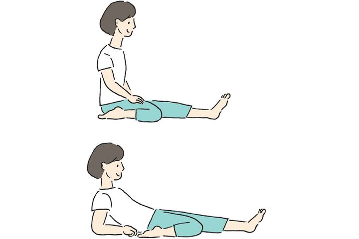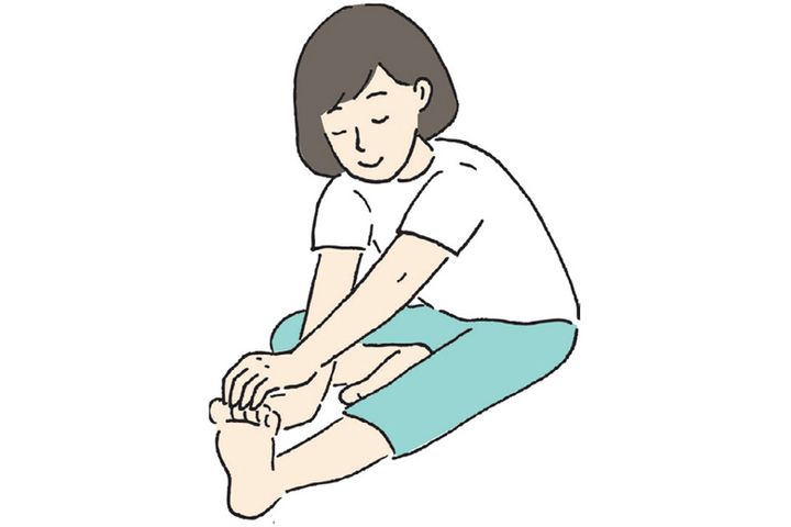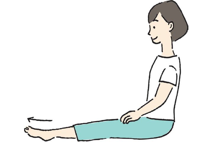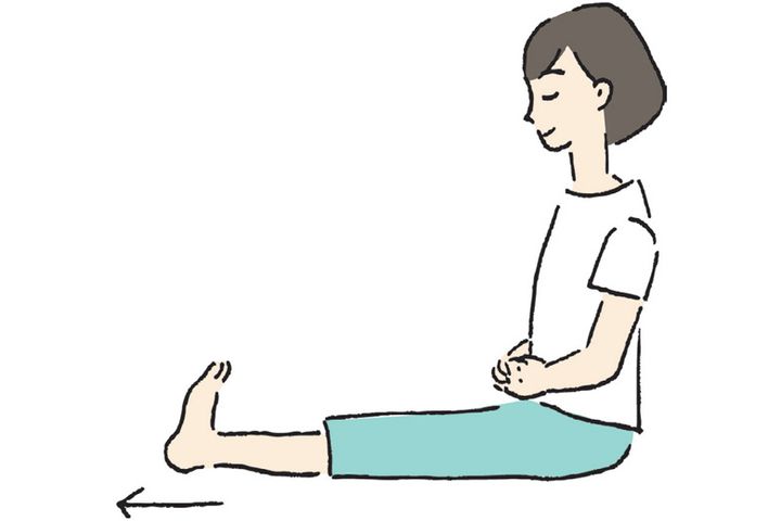 床の上で両足を伸ばすように座り、鼻からゆっくり息を吐きながらつま先を前方へ伸ばします。息を吐き終えるタイミングで甲が伸びきるようにするといいでしょう。そして息を吸いながら体をゆるめ、元に戻します。