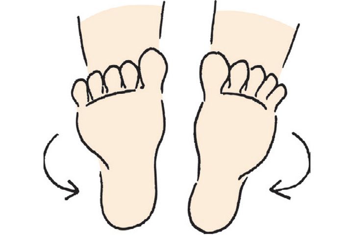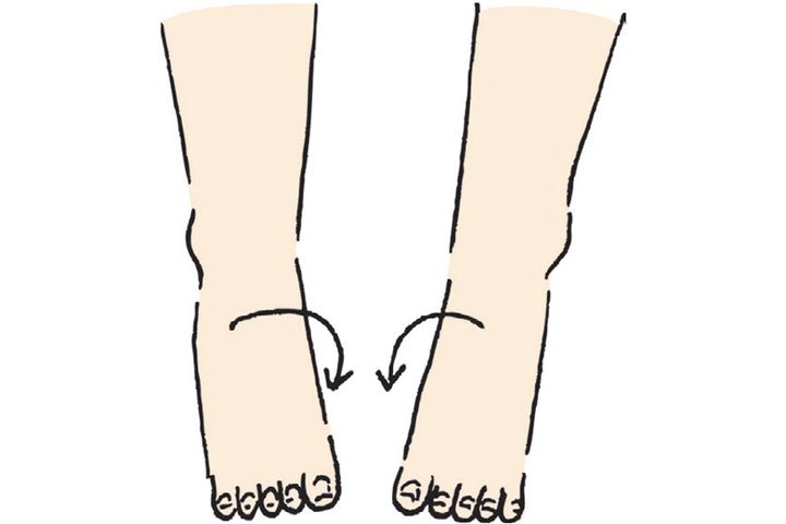 両足のつま先を前方へ伸ばして、それぞれの親指の方向へ足先をゆっくりと回します。次にかかとを前方へ突き出し、それぞれの小指の方向へゆっくりと回します。左右の足の違いを観察しましょう。
