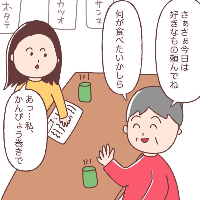 美味しそうにかんぴょう巻きを食べるカスミさん。嬉しそうですが義母の方が「本当にそれだけでいいの?遠慮してる?」と気を遣ってしまうのですね。