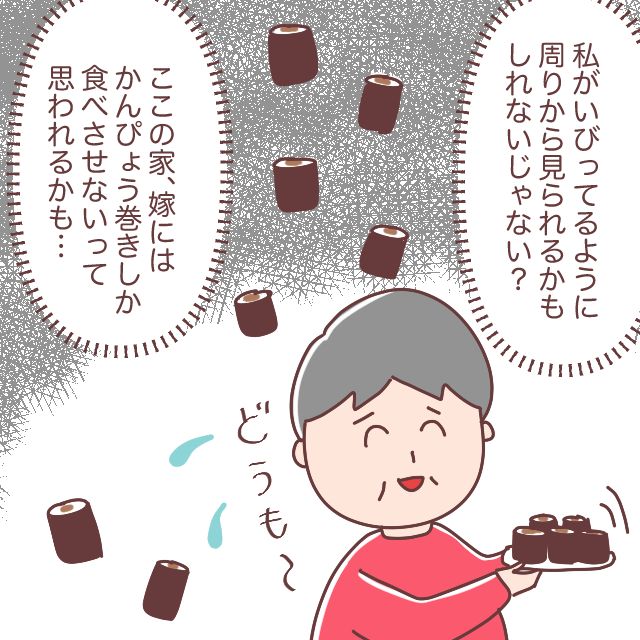 私がカスミさんをいびっているように周りから見られるかもしれないじゃない?嫁にはかんぴょう巻きしか食べさせないケチな姑だと思われるかも。そう考えてしまって内心ヒヤヒヤしていました。