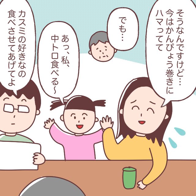 「今はかんぴょう巻きにハマってて」と笑顔で言うカスミ線の横で、息子が「カスミの好きなの食べさせてあげてよ。」と言います。孫のナツミちゃんは嬉しそうに「中トロ食べる~」と言ってくれました。