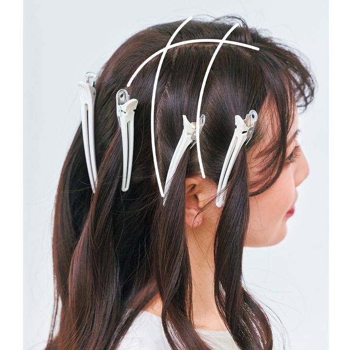 1.6~8つくらいの縦スライスに分けたら、手前の髪を26mmのアイロンを縦に使って毛先から根元までリバースに。