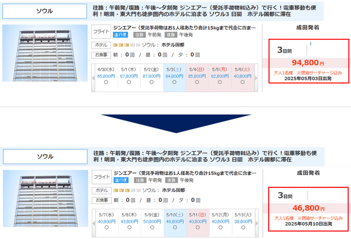 例えばこちらのソウル3日間のツアー。中身は全く同じですが、GW期間中の5/3出発と、一週間後ろ倒しした5/10出発だと値段が倍近く変わってきます。