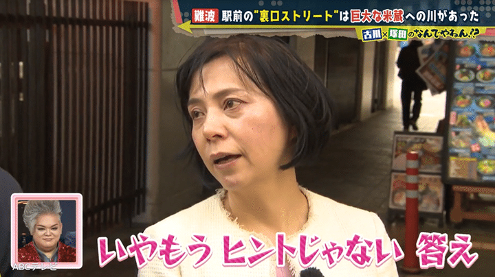 塚田と古川アナの推理の結果は、100点満点中……0点! 森さんが言っていた「現代にも通ずる、ある問題」とは、連日ニュースで取り上げられている米不足のこと。そして巨大施設とは、江戸時代中期に起きた享保の大飢饉をきっかけにつくられた、幕府の備蓄用米蔵「難波御蔵」だ。難波御蔵に米を運ぶためにつくられた難波新川が、時を経て裏口ストリートになったのだった。
