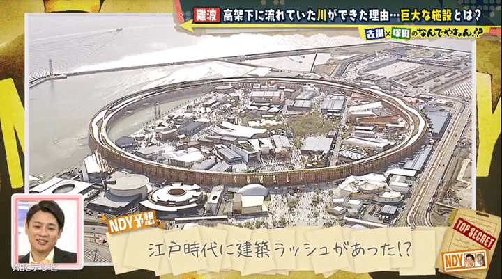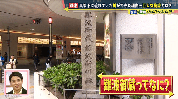 塚田と古川アナのその予想は的中! 阪神高速道路ができる前のこの場所には、かつて「難波入堀川」「難波新川」と呼ばれる川が流れており、道頓堀に繋がっていた。つまり、川だった裏口側が道になったため、裏口ストリートになったのであった。そして、歴史探訪プランナーの森なおみさんいわくその難波新川は、とある巨大施設のためにつくられたという。それは「現代にも通ずる、ある問題を解消するために重要な施設」だったのだとか。