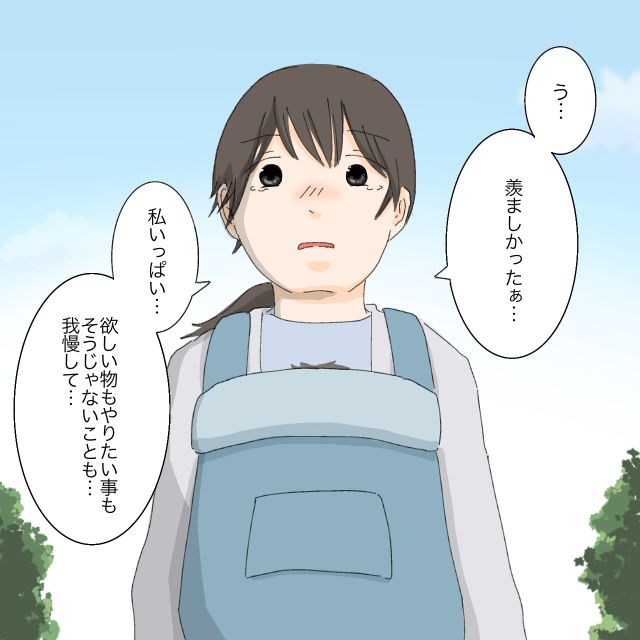 そしてようやくずっと心の中で渦巻いていたモヤモヤの正体がわかった気がして、みや子さんに言いました。「羨ましかったぁ。私、いっぱい・・・欲しいものもやりたい事もそうじゃないことも、我慢して・・・」言いながらまた涙が溢れてきました。