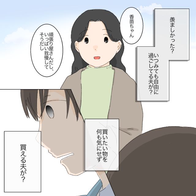 夫が1本1万円もするお酒を買ってきた時、なぜか無性にイライラして涙を流して怒りだしてしまった私。でもみや子さんに「羨ましかった?」と聞かれてドキッとしました。「香苗ちゃん頑張り屋さんだし、いっぱい我慢してそうだし」と言われて、あらためて自分の気持ちと向き合いました。