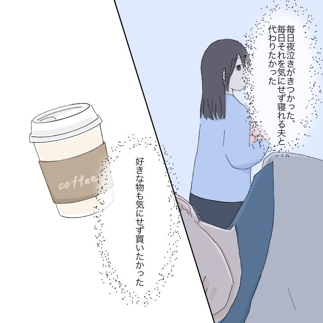 私、本当は毎日夜泣きがきつかった。毎日それを気にせず寝れる夫と、代わりたかった。好きなものも気にせず買いたかった。朝散歩のときのコーヒーも、焼きたてのパンも、それにスーパーで我慢したお菓子だって!気にせず買いたかった。