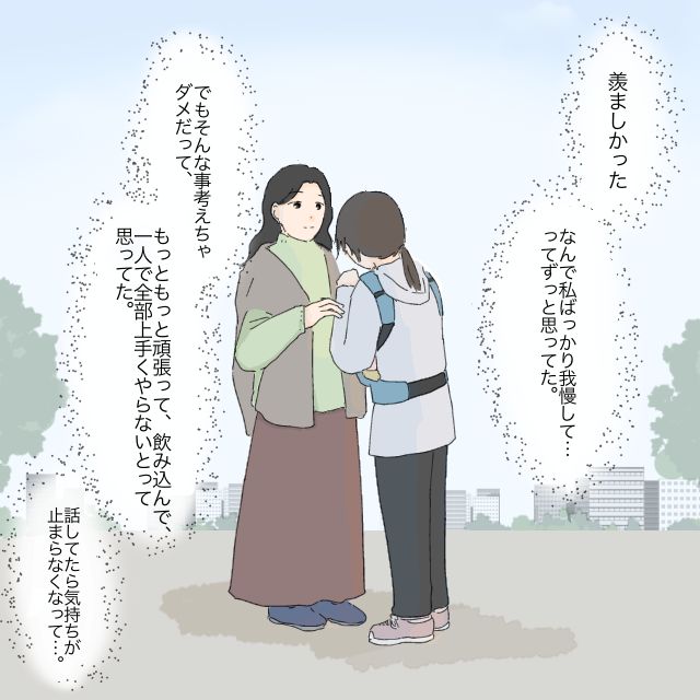 辛くても疲れてもずっとひとりで頑張って、生活費を稼いでくれているご主人に抱っこすら「代わって」と言えず、我慢してきた香苗さん。次第に自分の気持ちに蓋をしてわからなくなってしまっていたのかもしれませんね。みや子さんの発言で本当の気持ちを言葉にできて、ようやく「辛い」と自覚することができたのですね。