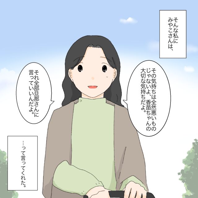 思いつくままに泣きながら話す私に、みや子さんは「その気持ちは全然悪いものじゃないよ。香苗ちゃんの大切な気持ちだよ。それ、全部旦那さんに言っていいんだよ。」優しい笑顔でそう言ってくれました。