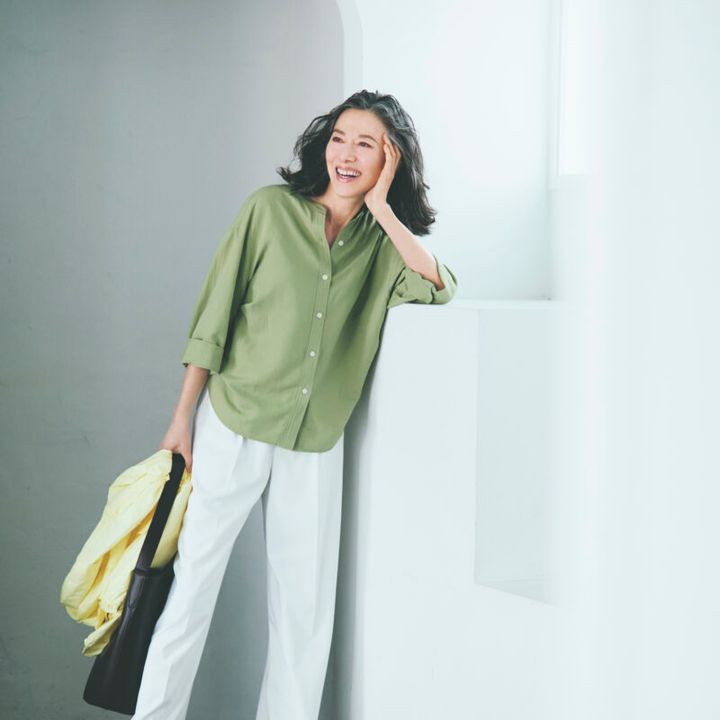 「シンプルなシャツは袖がやや太めなのがいまどき。裾がラウンドしているから、片側だけウエストインしてもしゃれて見えます。きれいめな白いパンツもなんにでも合わせやすくて便利です」