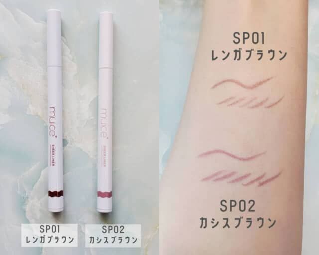 ▲ミュアイス「シリライナー」 全7色(写真はSP01レンガブラウン、SP02カシスブラウン) 各¥770(税込) ※限定販売