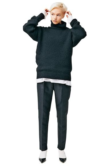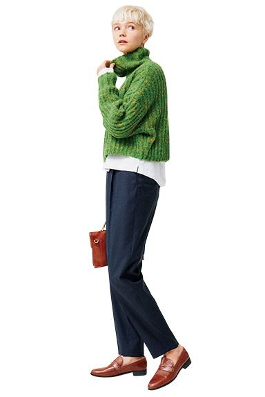 胸元が大きく開いた深めVの女度を軽減させたいとき。ネック広めのカジュアルなロンTで肌面積を減らせば、とたんに親しみやすく。
