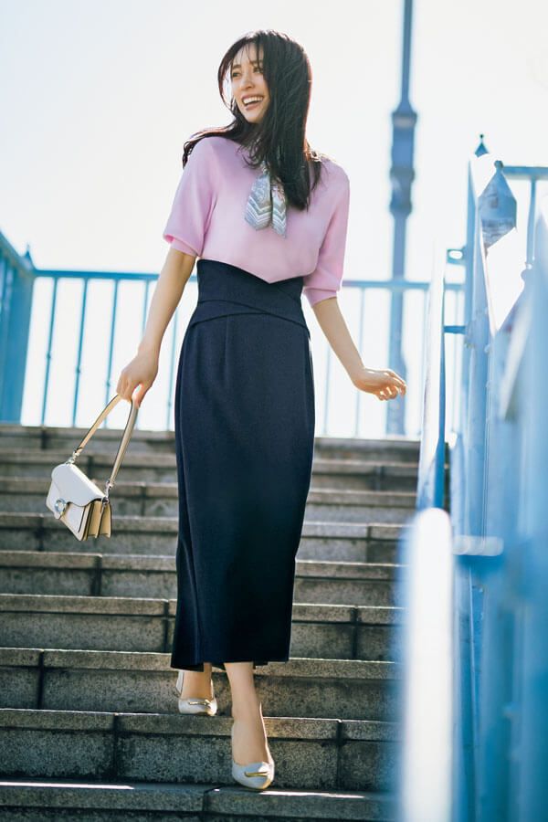 淡いベビーピンクニットを濃紺のタイトスカートできりっと引き締め