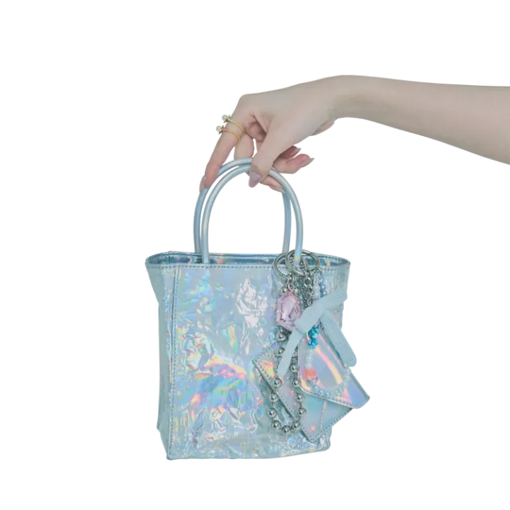 ブルーのバッグにピンクのハートチャームをあわせたら、さりげなく甘さをプラス。