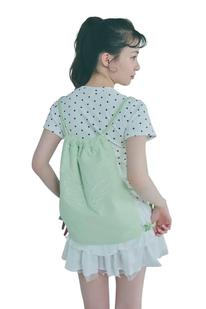 リュックではなく、あえてのナップサックで乙女の幼心を刺激。カラーは儚げで可愛いミントグリーンをチョイス♡