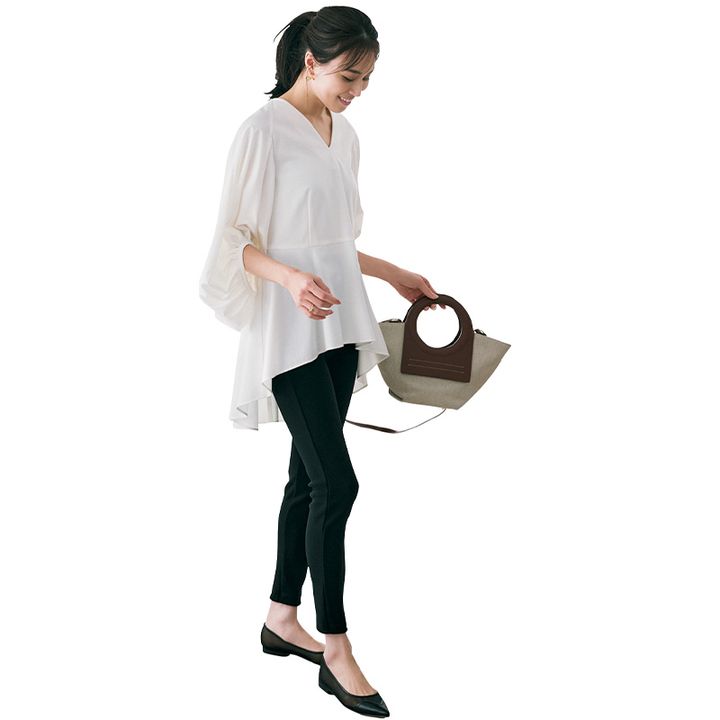 動くたびに揺れるペプラムデザイン、袖のドレープなど、ロンTでありつつたっぷり甘さに浸れる一枚は黒パンとは鉄板の相性。ストレッチの利いたレギンスで甘モノトーンに。