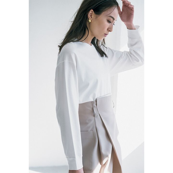 「幅広の身幅で丈も袖も長め。オーバーサイズでいて女性らしいシルエットが際立つ、計算されたビッグロンT!袖をまくったときのくしゅくしゅたまる感じもいい!」(北山)
