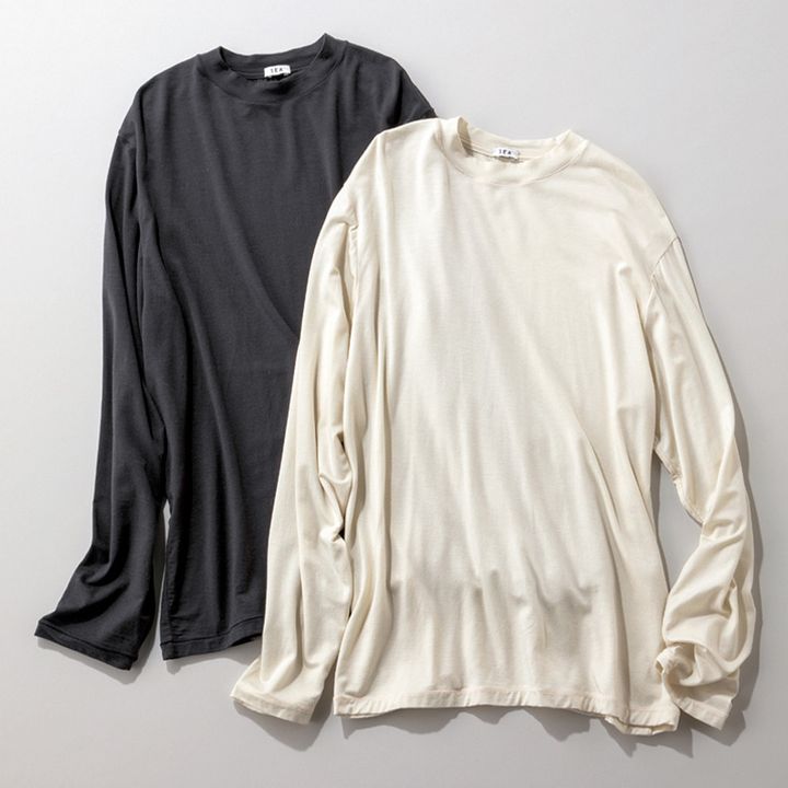 「ベーシックでいてどこかこなれて見えるロンT上手!とスタッフの間でもファンの多いSEA。このシリーズは一般的なロンTよりもグッと長い着丈で、パンツとのワンツーも新鮮なバランスに。もちっとしたリッチな生地は一度着るとやみつき!」(北山)