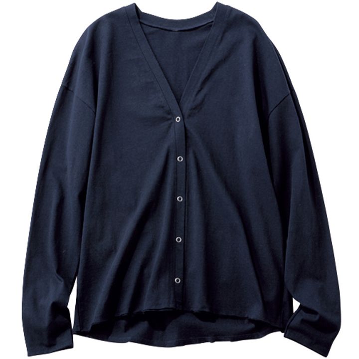 オーバーサイズ&Vネックが新鮮なスナップカーデ。ゆるっとリラクシーなムードで着るのも素敵!