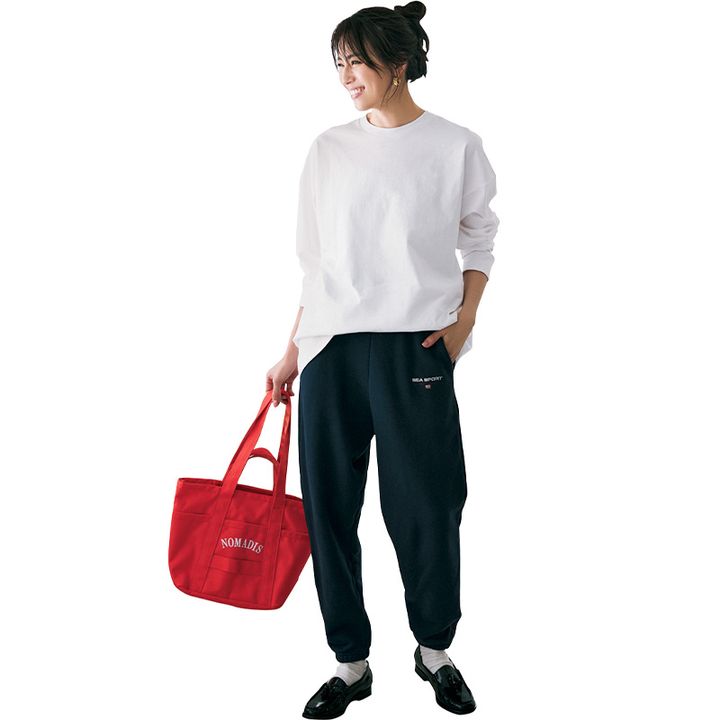 ロンT¥9,900(アンダーソン アンダーソン)パンツ¥28,600(ル フィル/ル フィル ニュウマン新宿店)ピアス¥42,900リング¥44,000(ともにマリハ)バッグ¥48,400(ヴァジック/ヴァジックジャパン)トートバッグ¥26,400(エイトンステイプルズ)パンプス¥39,600(ピッピシック/ユナイテッドアローズ 六本木ヒルズ店)ヘアゴム¥13,420(ジェニファー オーレット/ズットホリック)