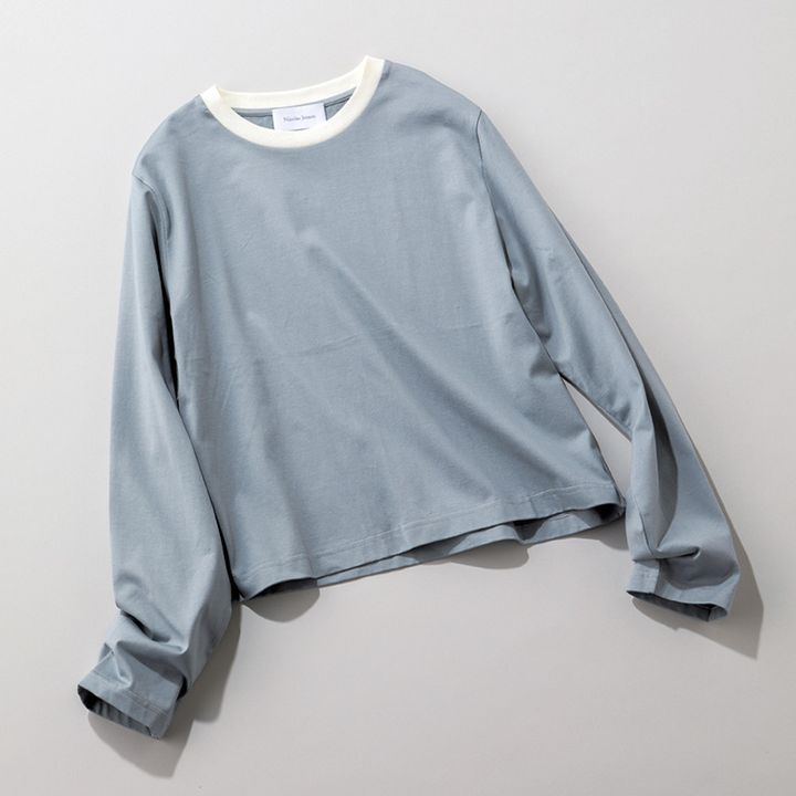 ・いい塩梅で首元に白を効かせられるネックと長めの袖がこなれて見える!ロンT¥12,100(yori)