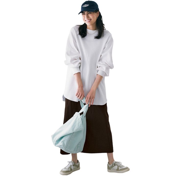 ベーシックこそ、サイズ感でトレンドに乗っかるのも手。スウェット合わせも、堂々お出かけ着に!