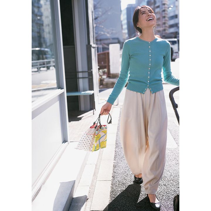 カーディガン¥28,600(アニエス・ベー)パンツ¥26,400(カレンソロジー/カレンソロジー 二子玉川)ピアス¥31,900(マリハ)バッグ¥23,100(マニプリ)シューズ¥22,990(J&M デヴィッドソン/モーダ・クレア)