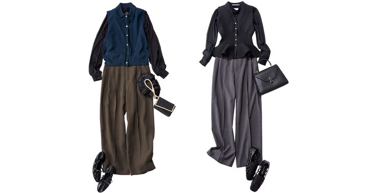 ペプラムベスト¥44,000(コルコバード/フィルム)カットソー¥11,550(スローン/ザ ショップ スローン 新静岡セノバ店)タックパンツ¥29,700(ウィム ガゼット/ウィム ガゼット 玉川高島屋S・C店)バッグ¥649,000(ヴァレクストラ/ヴァレクストラ ジャパン)靴¥173,800(セルジオ ロッシ/セルジオ ロッシ カスタマーサービス)