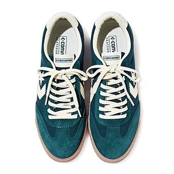 グリーンスエード×キャンバススニーカー「ロードクラシック SK OX」 11,550円/コンバース(コンバースインフォメーションセンター) マットなスエードを採用した、深みのあるレトロなカラーリング。アッパーと連動したカラーのスペアシューレースが付属。