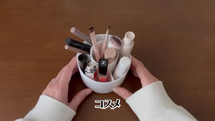 コスメを収納すると、こんな感じ。仕切りつきなので、リップやアイブロウなどのコスメをカテゴリごとに分けて入れられるのがうれしいポイント。くるくる回して向きを変えれば、メイク中に使いたいコスメをすぐに見つけられます。朝のメイク時間の時短にもつながりそう!