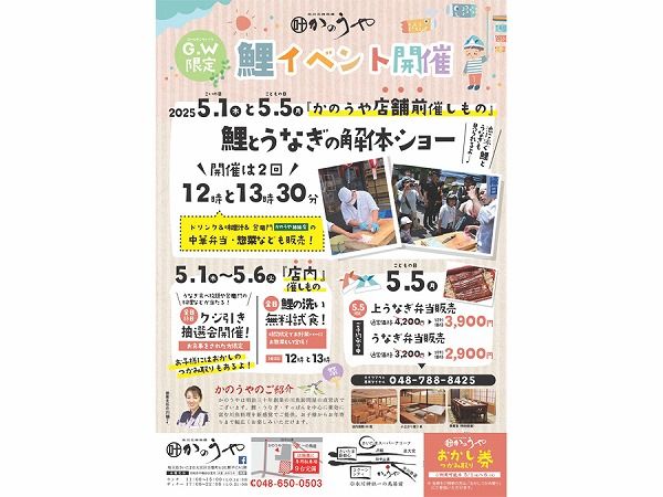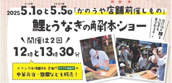 5/1(木)と5/5(月)の12:00と13:30には店舗前で鯉とうなぎの解体ショーを実施。 池に泳ぐ鯉とうなぎも見ることができるほか、ドリンクや味噌汁、かのうやの姉妹店である「登竜門」の中華弁当や総菜なども販売します。
