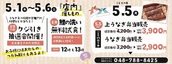 また、5/1(木)~5/6(火)には店内の催し物として、クジ引き抽選会や子ども限定のおかしつかみ取り、人気のお野菜バーに鯉の洗いが登場する嬉しいイベントも。 さらに、5/5(月)には「上うなぎ弁当」「うなぎ弁当」を通常価格から300円オフの特別価格で販売します。