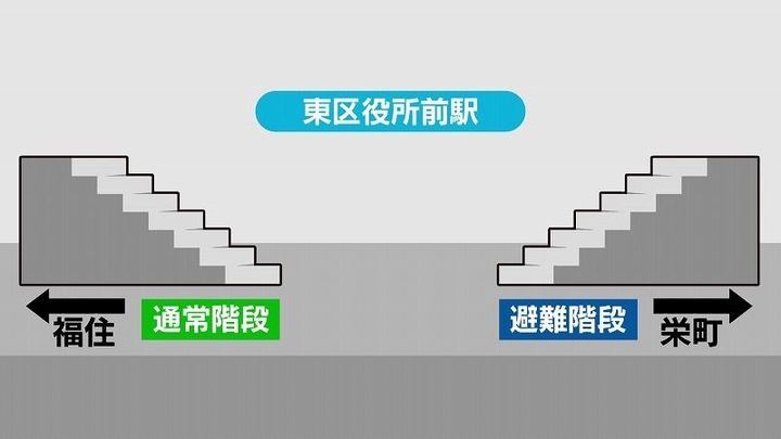 例えば、東区役所前駅の場合、改札の位置の都合上、福住方面には通常の階段がありますが、栄町方面にはありません。